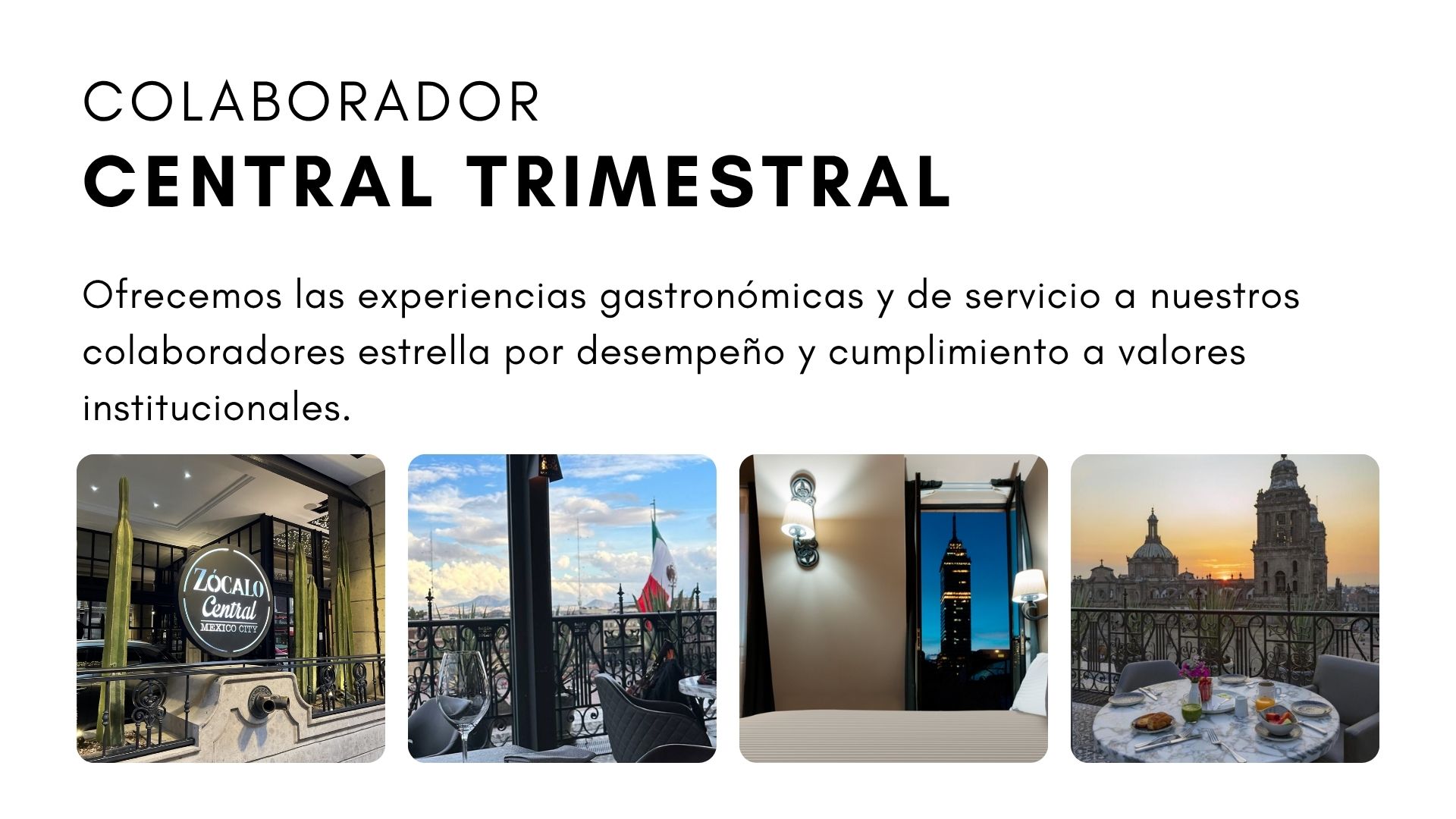 Ubicado en el 6° piso del hotel Zócalo Central, posee una vista privilegiada al primer cuadro de la Ciudad de México, desde donde se puede apreciar el Palacio Nacional y la Catedral Metropolitana. Además, de presentar una propuesta gastronómica personalizada, ya que nuestros visitantes podrán descubrir nuestros platillos de temporada de Cocina Mexicana Contemporánea, en donde los sentidos y emociones evocan recuerdos memorables.